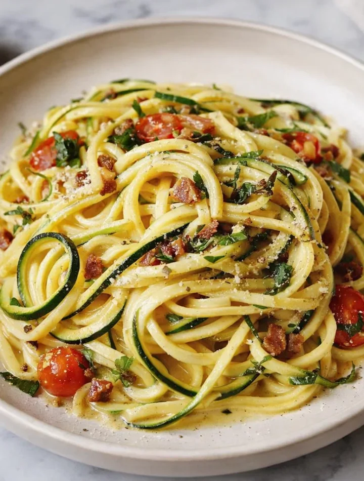This zucchini noodle carbonara takes traditional Italian flavors and gives them a modern twist. With lightened-up ingredients, it’s both vegan and gluten-free, making it perfect for those with dietary restrictions. The combination of cherry tomatoes and fresh basil adds a burst of color and flavor, creating a visually appealing dish that will have everyone coming back for seconds. Whether you’re a busy parent trying to sneak in healthy options for your family or a culinary enthusiast looking for innovative recipes, this zucchini noodle carbonara will satisfy all cravings while keeping the whole family happy.