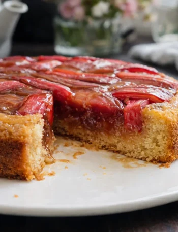 Delightful Presentation: The upside-down presentation makes this cake visually stunning. The vibrant pinkish-red rhubarb peeking through the cake not only makes it appealing but also makes it a centerpiece at any gathering.