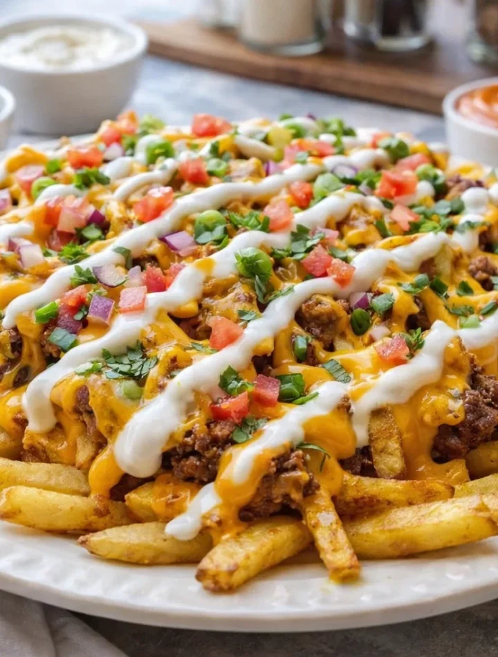Secondly, let’s talk about the health benefits of this loaded fries dish. While the traditional loaded fries can be calorie-packed, our recipe emphasizes using lean ground beef, fresh toppings, and a variety of vibrant vegetables. Incorporating healthier ingredients allows you to enjoy rich flavors without the guilt. Plus, you can easily tailor the ingredients to accommodate various dietary preferences—vegan cheese for lactose intolerants, gluten-free options for those avoiding gluten, and even baked or air-fried fries for a lighter version.