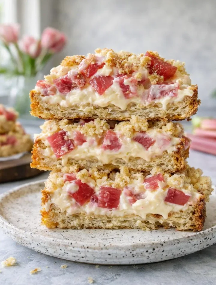 Top with Rhubarb: Spoon the warm rhubarb mixture atop the cream cheese, spreading it evenly across the slices. This adds a pop of color and flavor!