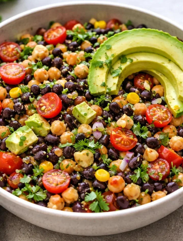 Imagine a bowl filled with protein-rich black beans and chickpeas, vibrant veggies, and a zesty dressing that creates a burst of flavor in every bite. This recipe combines the wholesome goodness of legumes with fresh produce, offering a balanced meal that is both filling and light. Whether you’re a student in need of quick meal prep ideas, a parent looking for a nutritious option for the family, or a working professional trying to maintain a healthy lifestyle, this salad bowl is versatile enough to meet your needs.
