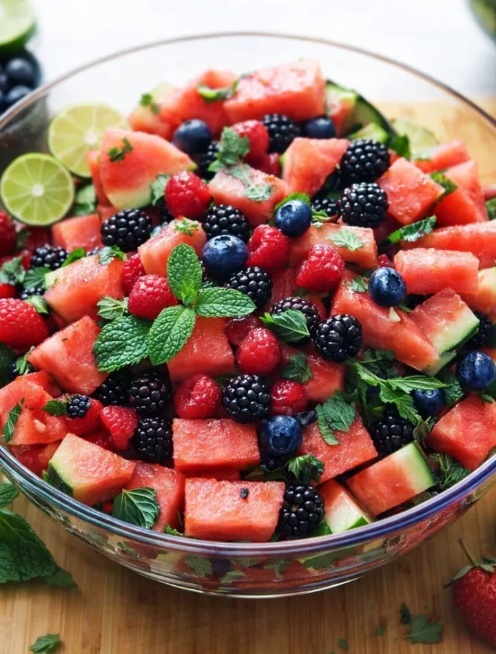 Imagine a warm day; you return home from a stressful work shift, or perhaps you just finished a workout. A bowl of Watermelon Berry Summer Salad is not only an easy-to-make treat but also a guilt-free indulgence rich in vitamins, minerals, and antioxidants. Bursting with hydration from the watermelon and packed with fiber from the berries, each bite provides a refreshing burst of goodness.